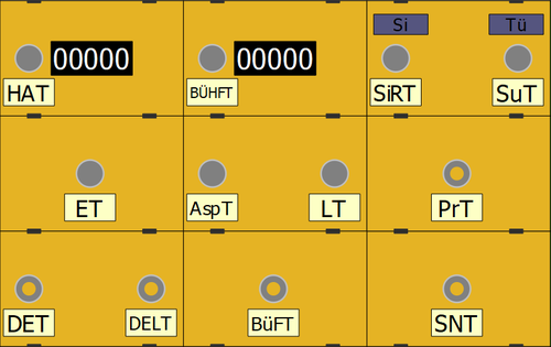 Die Taste des Bahnübergangs mit dem gelben Punkt wird auch Bahnübergangstaste (BÜT) genannt. Diese wird für Bedienhandlungen verwendet, die die gesamte Anlage betreffen. Gleichzeitig ist die Taste auch Gleistaste (GlT) für das zugehörige Gleis. Die Gleistaste wird für gleisbezogene Aktionen verwendet.