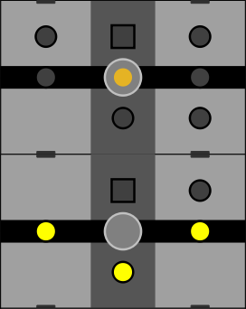 Zweigleisiges Bahnübergangsfeld mit Bahnübergangstaste oben und Gleistaste unten. Der Bahnübergang ist gleisbezogen für das untere Gleis eingeschaltet, dieses Gleis ist hilfsfreigemeldet.