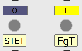 Fernsteuerungsmelder "O" und "F" mit Tasten STET und FgT auf einem Fernsteuerungs-Gruppentastenfeld auf dem Ortstisch. Der Leuchtmelder "F" zeigt gelbes Ruhelicht, die Fernsteuerung befindet sich im Fernbetrieb, die Bedienung durch den Ortstisch ist deaktiviert.
