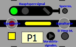 Hauptsperrsignal P1 in Fahrtstellung auf einem S60-Tischfeld. Mit Vorsichtssignalmelder, Zugstraßen- und Rangierstraßentaste.